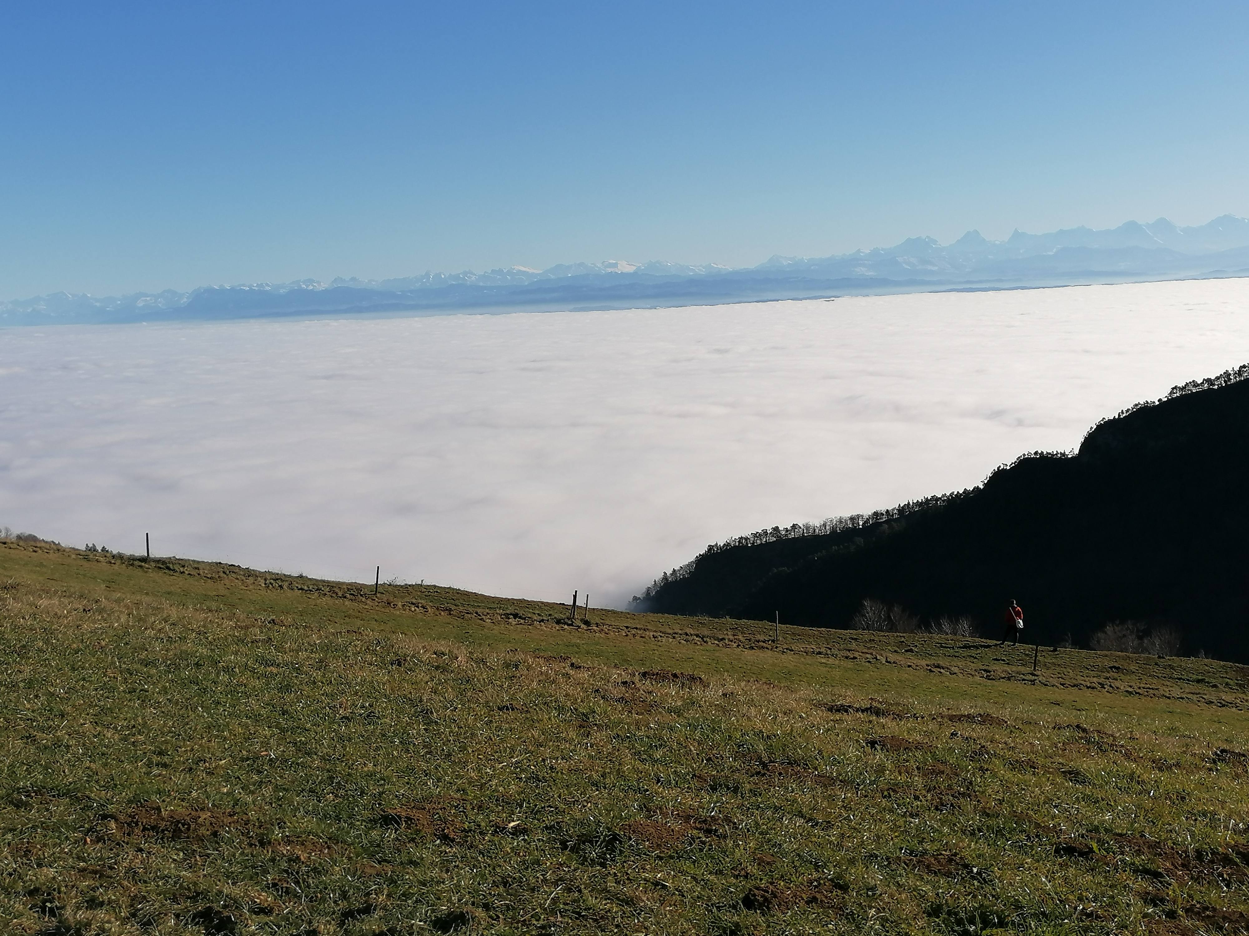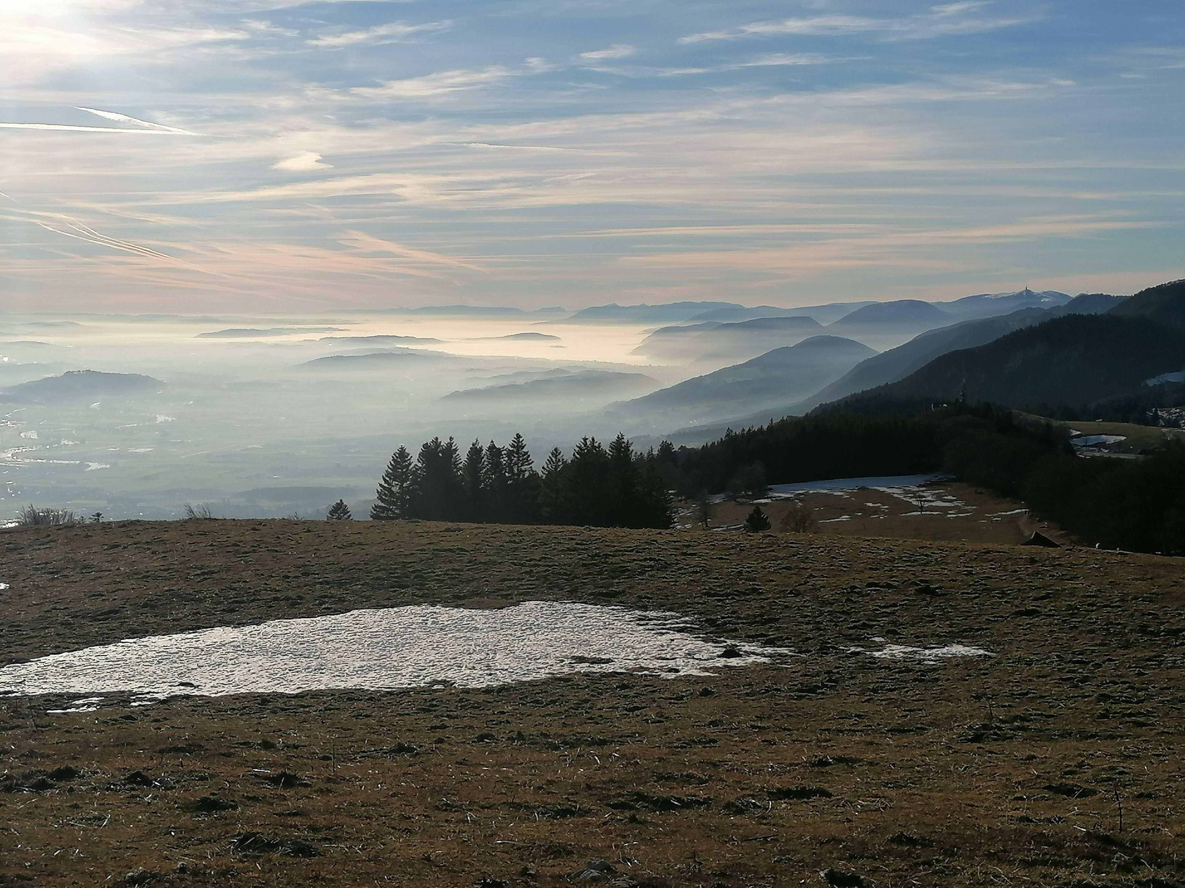 Bien que des chutes de neige copieuses aient blanchi le Jura il y a 2 semaines, il n’en reste à peu près rien à cause de températures anormalement douces pour la saison. Nous avons fait une boucle de 20 km, en montant 1300 m, incluant les deux plus hauts sommets du canton (Hasenmatt, 1445 m et Röti, 1395 m). Nous étions en T-shirt… le 1er janvier..!