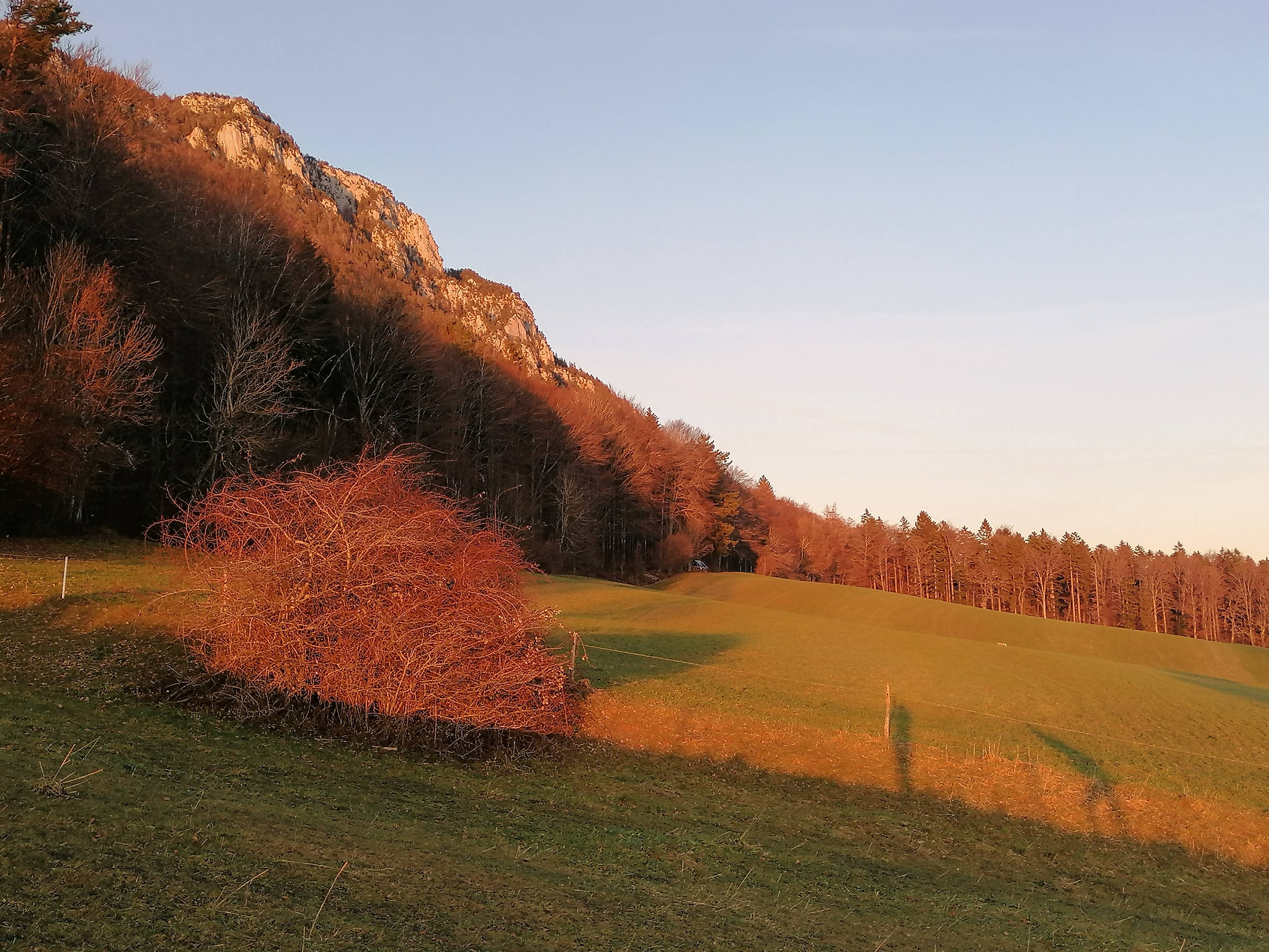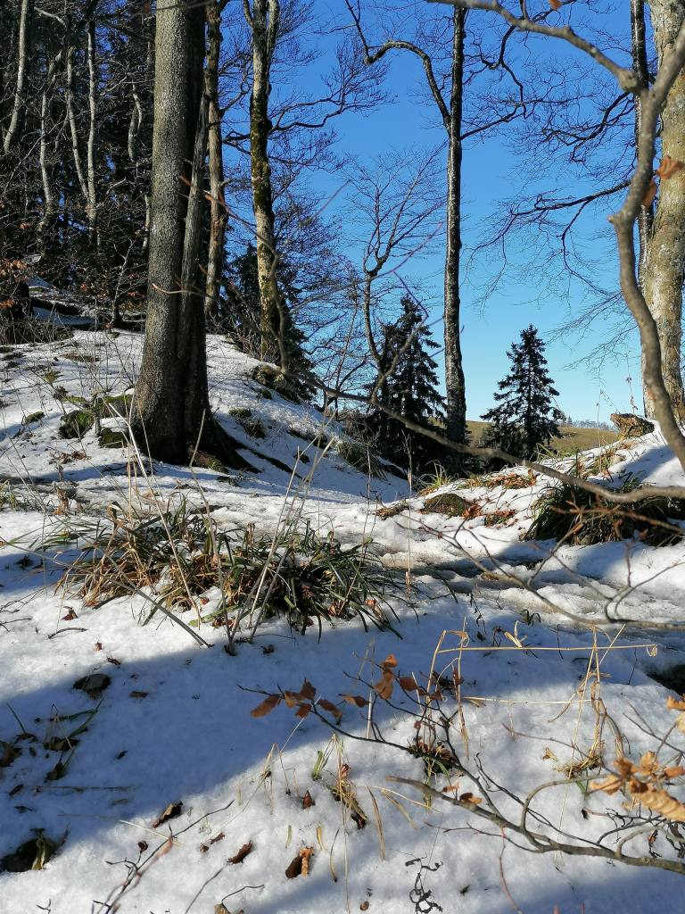 While a lot of snow fell on the Jura about two weeks ago, most of it is gone now due to unusually warm weather. We actually hiked up and picknicked in T-shirts on the highest summit of the canton at 1445m (Hasenmatt), temperatures were between 13 and 15°c up there on January 1st! It was a pleasant loop of 20 km, taking in the second highest (Röti, 1395) as well for a total up of 1300m.