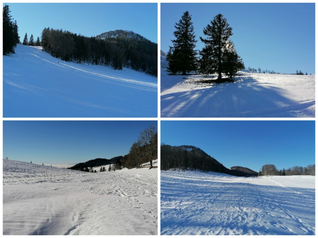 Our first snowshoe outing saw us leave from Oberbalmberg and head towards Weissenstein, on the Jura. A fresh quantity of snow had fallen about one week ago and the local skilifts were working. We crossed the ski slope and walked up through the forest, on a well trodden path. We prefer making our own path in open fields but there was no other way.