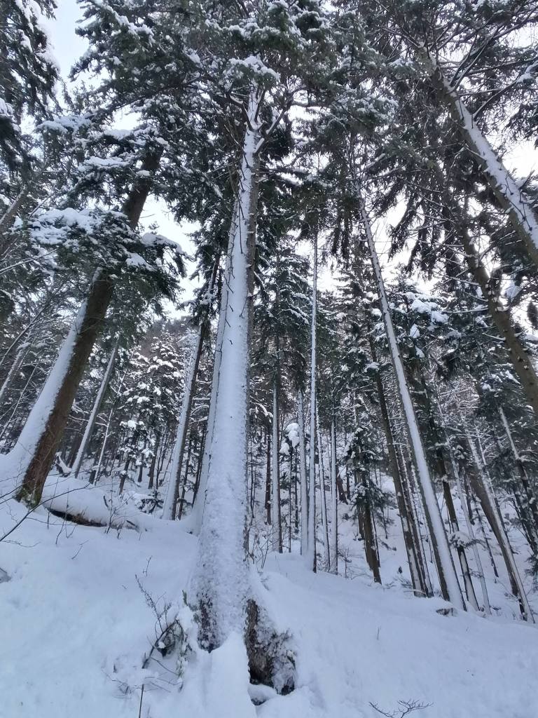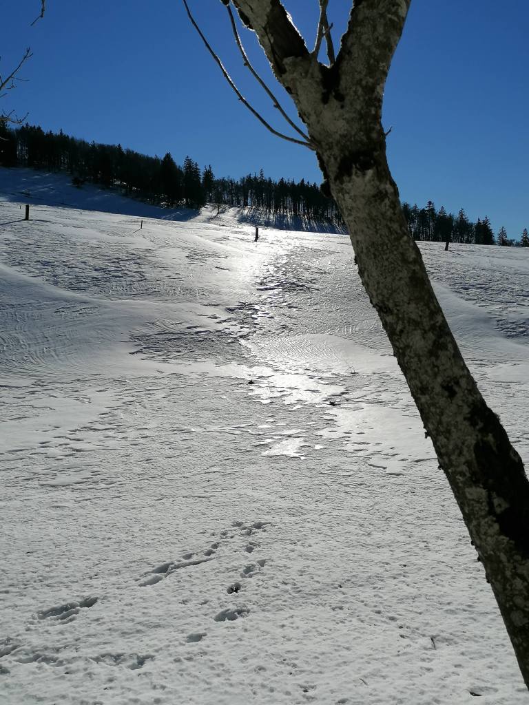 De là-haut une longue descente, d’abord dans la forêt jusqu’à la station intermédiaire des oeufs. Puis sur le flanc ombragé, magnifique descente parmi les arbres enneigé et gelé, à l’ombre mais sous le ciel bleu. Dans le dernier virage vers Oberdorf, nous avons retrouvé le côté ensoleillé.
