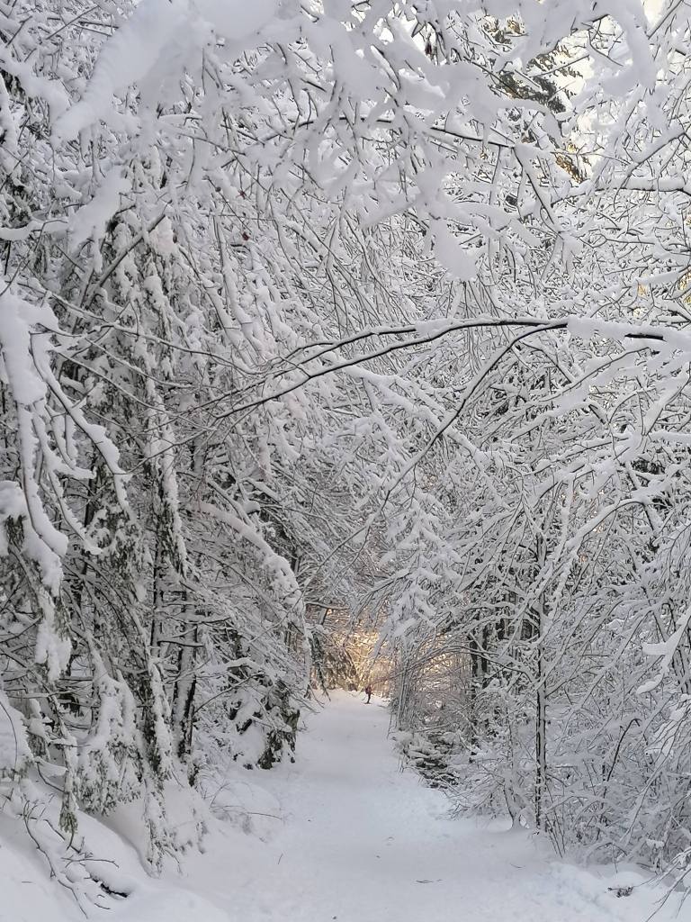 Then it was the long path down, the first part to the middle station of the gondolas again through woods. Then, being on the shady side of the mountain, we were surrounded by beautiful frozen trees, and a blue sky above. As we neared Oberdorf, we turned back onto the sunny side.
